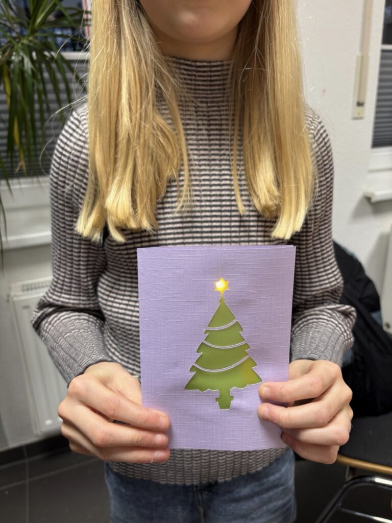 Zum Jahresabschluss wurde es im Jugendzentrum (JUZ) besonders kreativ: Kinder gestalteten individuelle Weihnachtskarten, die dank kleiner LEDs im Dunkeln leuchten! Mit Hilfe eines Schneideplotters entstanden filigrane Motive, die die jungen Bastler:innen selbst ausschnitten und mit Stiften, Transparenzpapier und elektronischen Schaltungen verschönerten.
